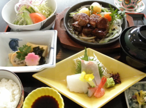 プラス料理は ・牛すき焼 ・牛サイコロステーキ ・茶碗蒸し+おろしそば ・ケーキとフルーツ&コーヒー の四種の中からお選びいただけます